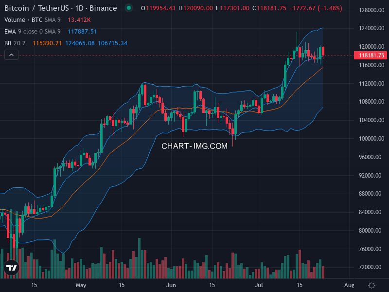 Trading volume has been variable, with a notable spike on July 18 at $59.2 billion, coinciding with a price dip to $117,738. This increase in volume during a price drop could indicate strong buying interest at lower price levels. Subsequent days saw a decline in volume, suggesting a reduction in trading activity or a balance between buyers and sellers.