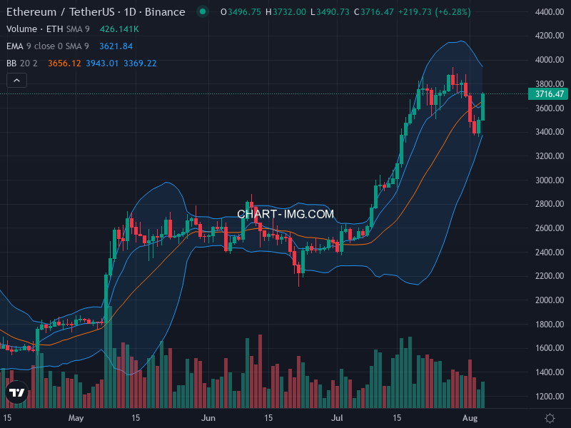 Ethereum has experienced notable volatility in recent days. The price peaked at $3,791 on July 29 but has since declined, reaching a low of $3,415 on August 2. However, a recovery to $3,716 by August 4 suggests a potential reversal. The current trend appears to be neutral to slightly bullish, with signs of upward momentum following the recent dip.